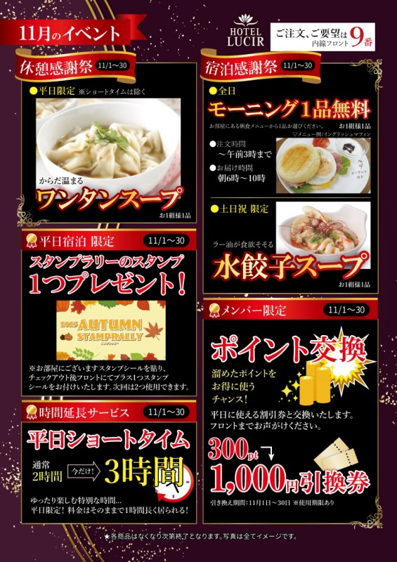 あたたかいスープとお得なサービスで、11月のHOTEL LUCIRは特別なひとときを演出します。ご不明点はフロント9番までお気軽にどうぞ。
